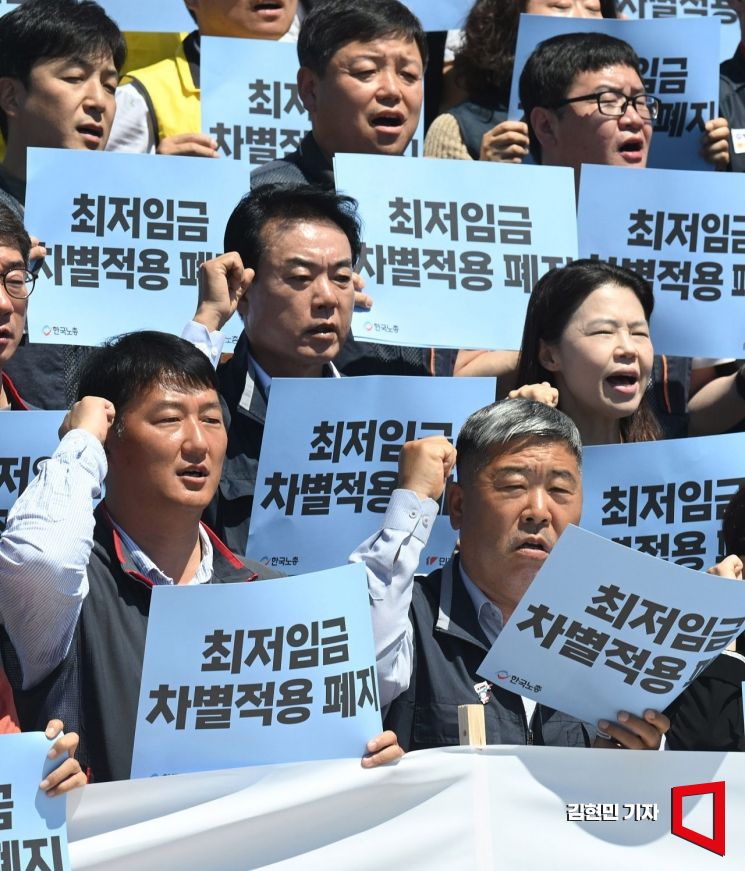 김동명 한국노총 위원장과 양경수 민주노총 위원장을 비롯한 양대 노총 조합원들이 3일 국회 본청앞 계단에서 '최저임금 차별금지법 국회 선포 기자회견'을 하고 있다. 사진=김현민 기자 kimhyun81@