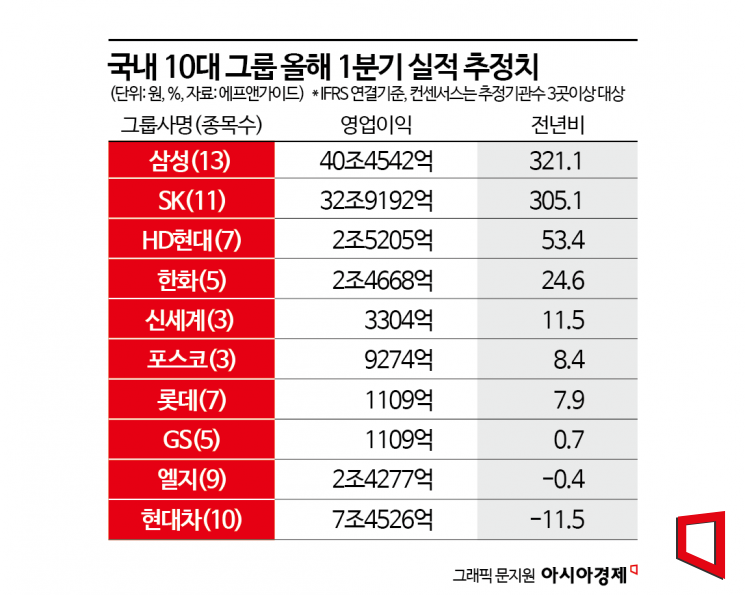 올해 1분기 국내 10대 그룹의 전체 영업이익이 전년 동기 대비 2.6배 증가할 것으로 전망된다. 다만 삼성과 SK가 전체 실적을 견인하면서 그룹사별 체감온도는 크게 엇갈릴 것으로 보인다.