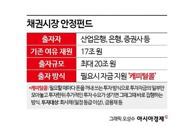 1일 금융권에 따르면 금융시장 안정을 위해 조성된 채안펀드에 약 17조원의 자금이 남아 있는 것으로 파악된다. 회사채·CP 매입 프로그램까지 합하면 약 30조원 규모로, 채권시장 변동성 확대에 대응하기에는 충분한 규모로 보인다. 채안펀드는 은행·증권·보험 등 금융권이 공동 출자해 시장에서 소화되지 않는 회사채 등을 매입하는 장치로 2008년 리먼브러더스 사태를 계기로 도입됐다. 83개 금융회사가 출자 약정을 맺고 필요할 때마다 자금을 집행하는 '캐피털 콜(Capital Call)' 방식으로 운용된다.