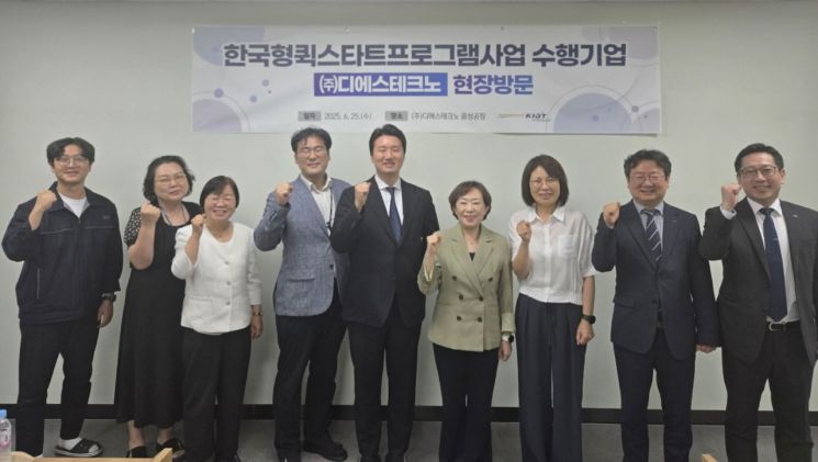 2025년 6월 25일 한국형 퀵스타트 프로그램 수행기업 현장방문 및 기업간담회에서 민병주 한국산업기술진흥원(KIAT) 원장(왼쪽 6번째)과 KIAT, 디에스테크노 관계자들이 기념촬영하고 있다. KIAT