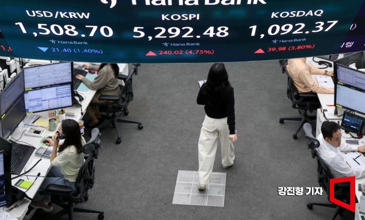 코스피 지수가 종전 기대감에 5%대 급등 출발하며 장 초반 매수사이드카가 발동한 1일 서울 중구 하나은행 본점 딜링룸 전광판에 국내증시 현황이 표시돼 있다. 이날 원달러 환율은 전 거래일 대비 21.6원 내린 1508.5원에 거래를 시작 했다.