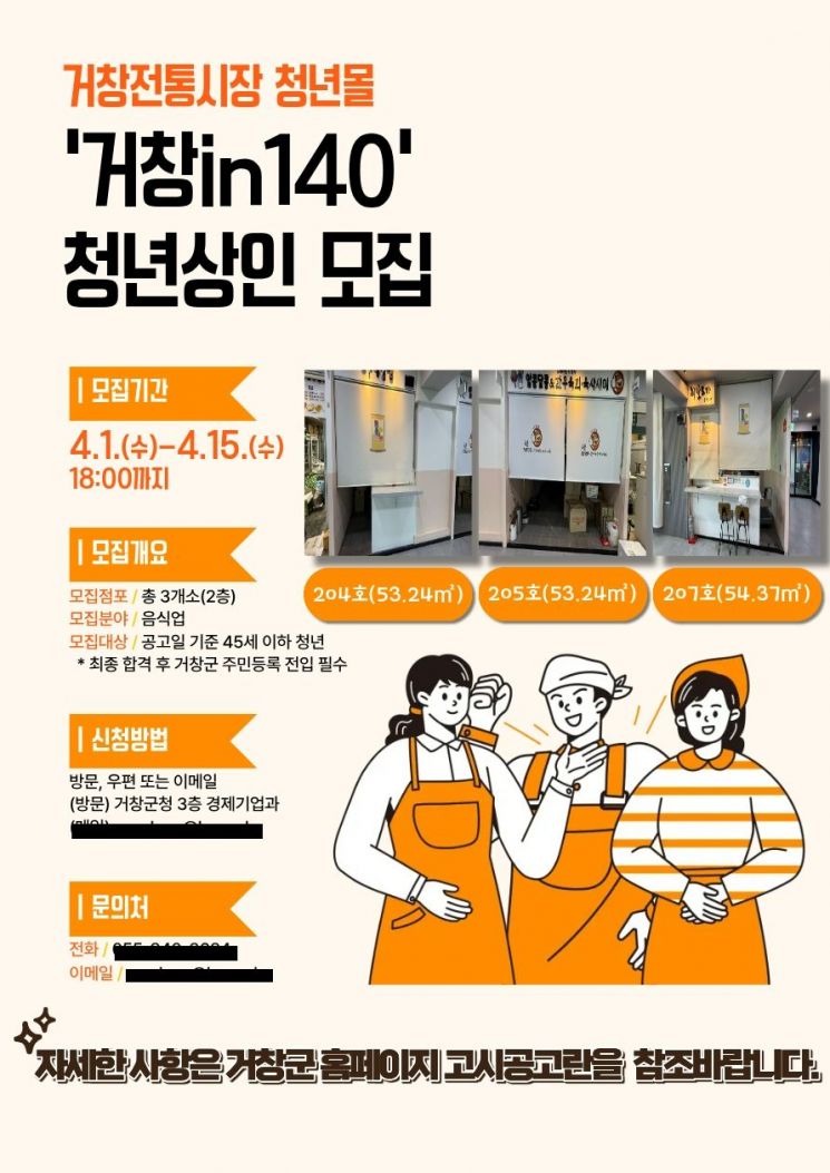 경남 거창군은 오는 4월 1일부터 15일까지 전통시장에 활력을 불어넣고 청년 창업 기반 조성을 위해 거창 전통시장 내 청년몰 '거창 in 140'에 입점할 청년 창업인 3명을 추가 모집한다.