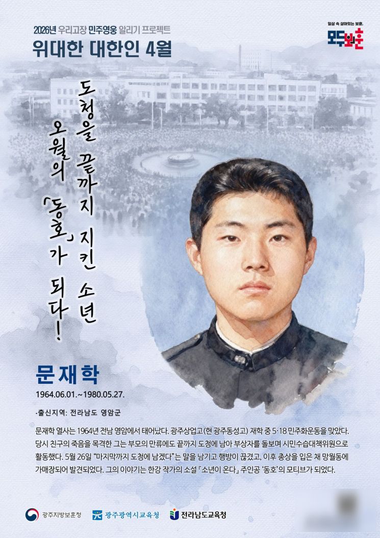 광주지방보훈청은 4월 '우리 고장 위대한 대한인'으로 5·18민주화운동 당시 전남도청을 끝까지 지키다 희생된 소년, 문재학 열사를 선정했다고 1일 밝혔다.