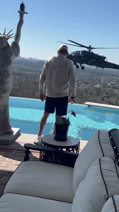 영상을 보면 도시 전경이 내려다보이는 저택의 수영장 위에서 헬기 한 대가 약 20초간 제자리 비행을 했고, 키드 록은 이를 향해 손뼉을 치고 경례를 하는 모습을 보였다. 이어진 장면에선 또 다른 헬기 한 대가 주변을 선회하자, 주먹을 들어 보이며 환호하기도 했다.