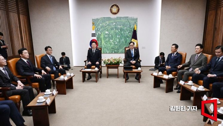 이 대통령은 이날 오후 국회의장 접견실에서 우 의장, 정청래 더불어민주당 대표, 장동혁 국민의힘 대표, 조국 조국혁신당 대표, 한병도 민주당 원내대표 등과 만나 "어려운 시기일수록 통합을 통한 힘을 모으는 대응이 정말로 중요하다"며 이같이 밝혔다.