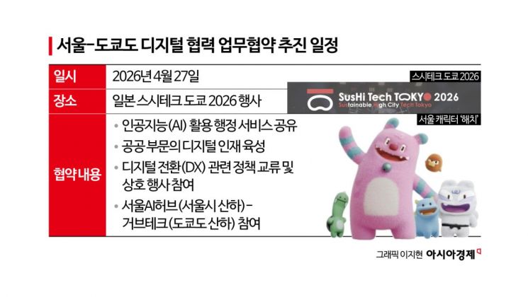 3일 서울시에 따르면 두 도시는 오는 27일 일본 도쿄도에서 열리는 '스시테크 도쿄 2026' 행사장에서 디지털 분야 교류 협력을 위한 MOU를 체결한다. 스시테크 도쿄는 '지속가능한 첨단 도시 도쿄(Sustainable High City Tech Tokyo)'의 줄임말로, 아시아 최대 규모의 글로벌 기술·스타트업 컨퍼런스다.