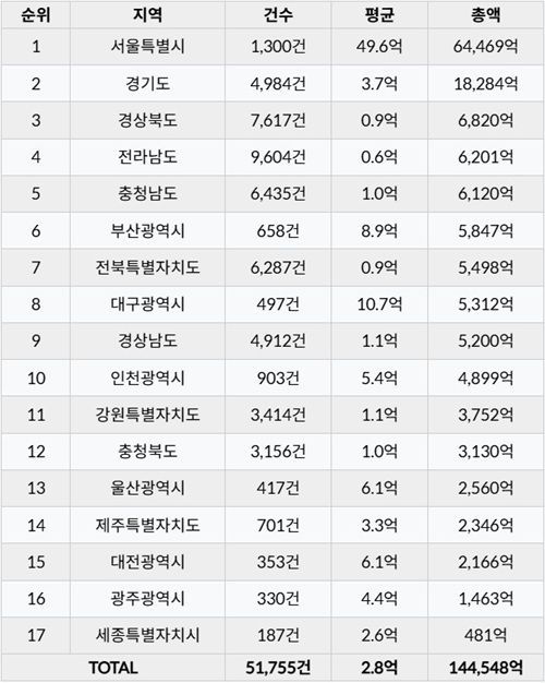 서울시는 약 6.5조 전국 1위 거래금액은 보였으며, 2위는 경기도 1.8조, 3위는 경상북도 6.8천억, 최하위 17위 지역은 세종특별자치시로 481억 원이 팔린 것으로 조사됐다. 또한 1채당 평균 거래금액은 서울시가 49.6억 전국 1위, 2위는 대구광역시 10.7억, 3위는 부산광역시 8.9억, 17위 전라남도 6천만 원으로 나타났다.