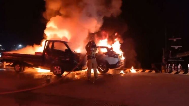 동승자 B씨(59·여)도 찰과상을 입는 등 두 사람 모두 경상을 입고 인근 병원으로 옮겨져 치료를 받고 있다. 차량에서 시작된 불은 화물차로 옮겨붙어 두 차량을 모두 태운 뒤 소방 당국에 의해 34분 만에 완전히 꺼졌다.