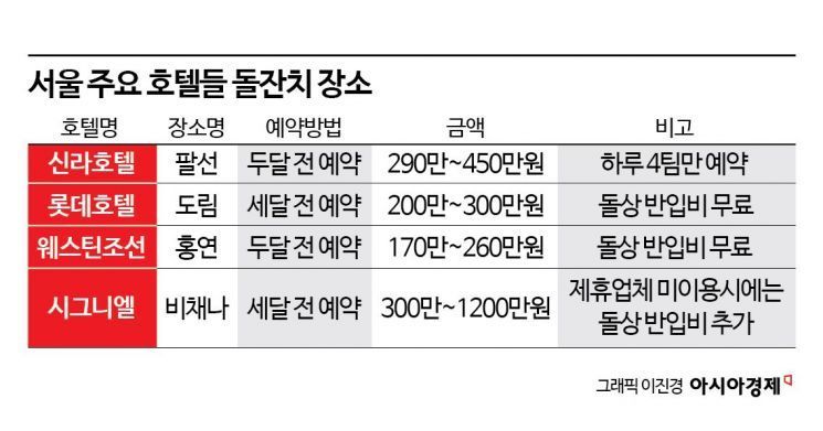 다른 호텔들도 비슷하다. 롯데호텔 서울 '도림'은 행사 약 3개월 전 예약을 시작하며 최소 이용금액은 200만~300만원 수준이다. 돌상과 스냅 촬영은 외부 업체를 이용해야 하지만 반입 비용은 별도로 발생하지 않는다.