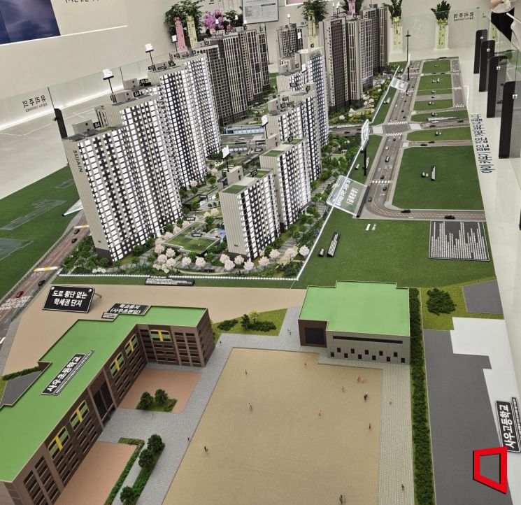 '풍무역세권 수자인 그라센트 2차' 견본주택에 전시된 단지 모형. 사우초·사우고가 단지 바로 앞에 맞닿아 있다. 불이 켜진 곳이 이번 분양 대상인 2차 단지이고, 뒤편에는 지난해 분양한 1차 단지(1071가구) 모형이 함께 전시돼 있다. 최서윤 기자