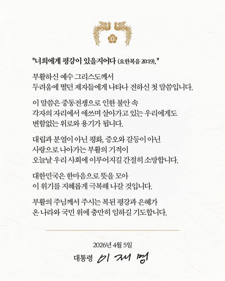 이 대통령은 "부활의 주님께서 주시는 복된 평강과 은혜가 온 나라와 국민 위에 충만히 임하길 기도합니다"고 덧붙였다.