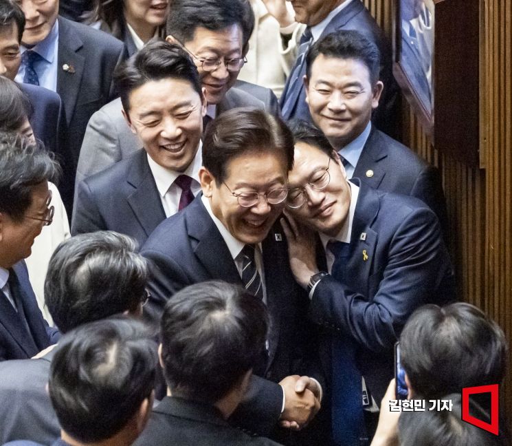 이재명 대통령이 지난 2일 서울 여의도 국회에서 열린 제433회국회(임시회) 제4차 본회의에서 중동 사태 대응을 위한 추가경정예산안에 대한 시정연설을 마치고 퇴장하며 국민의힘 의원들과 인사를 하고 있다. 2026.4.2 김현민 기자
