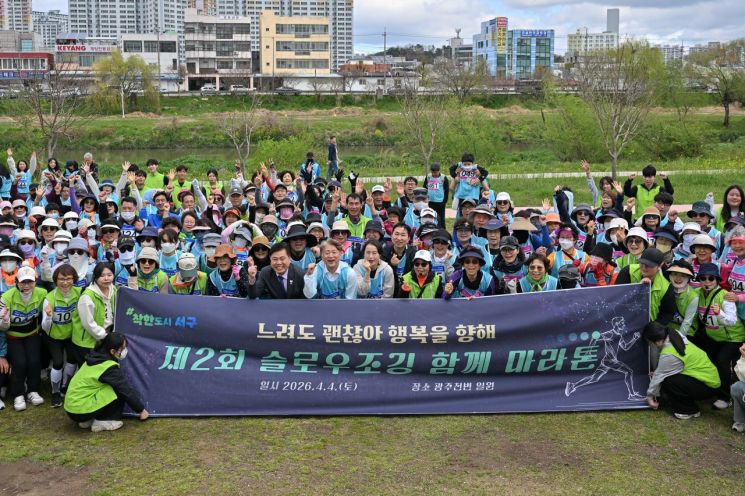 김이강 광주 서구청장이 4일 광주천변 일원에서 '느려도 괜찮아, 행복을 향해 함께 걸어요' 주제로 열린 '제2회 슬로우조깅 함께 마라톤'에서 슬로우조깅단, 서구민 등 참석자들과 기념 촬영을 하고 있다.