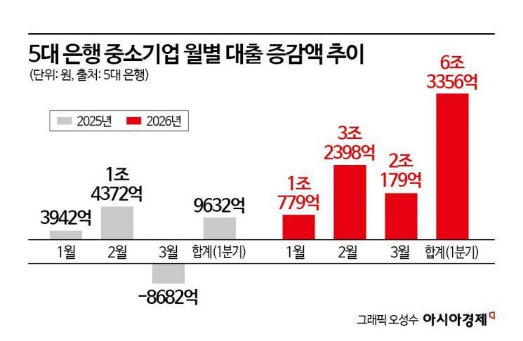 이는 전년 같은 시기와 비교하면 더 두드러진다. 지난해 중소기업 대출의 전월 대비 증가 규모를 보면 1월(3942억원), 2월(1조4372억원)이었고 3월에는 8682억원 감소했다. 지난해 1분기 전체 중소기업 대출은 9632억원 늘어나는 데 그쳤다. 반면 올해 1분기에는 6조3356억원 늘었다. 전년 같은 기간보다 5조3724억원이 더 늘어난 셈이다.