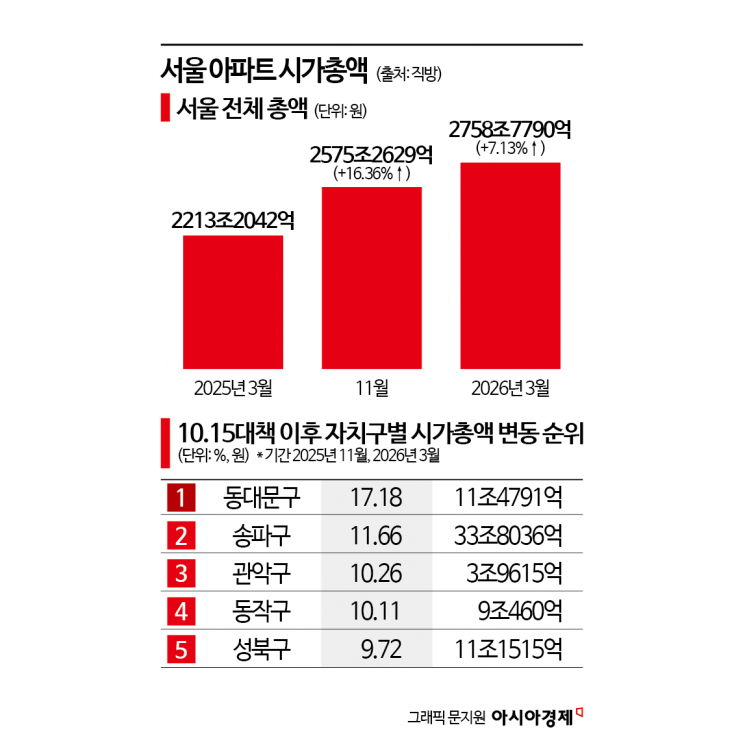 8일 부동산 플랫폼 직방이 제공한 '서울 자치구별 아파트 매매 시가총액' 자료에 따르면 지난달 기준 서울 아파트 전체 시총은 2758조7790억원으로 집계됐다. 10·15 대책 직후인 지난해 11월(2575조2629억원)과 비교해 7.13%(약 183조원) 증가했다.