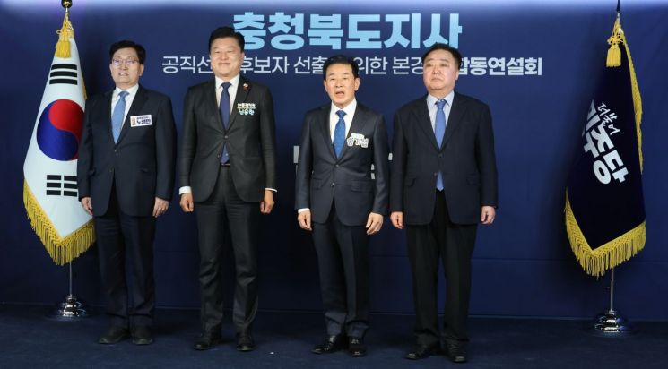 (서울=연합뉴스) 이동해 기자 = 24일 서울 영등포구 여의도 더불어민주당 당사에서 열린 충청북도지사 후보 선출을 위한 본경선 합동연설회에서 예비후보들이 기념 촬영하고 있다. 왼쪽부터 노영민, 신용한, 송기섭, 한범덕 후보. 2026.3.24 eastsea@yna.co.kr(끝)