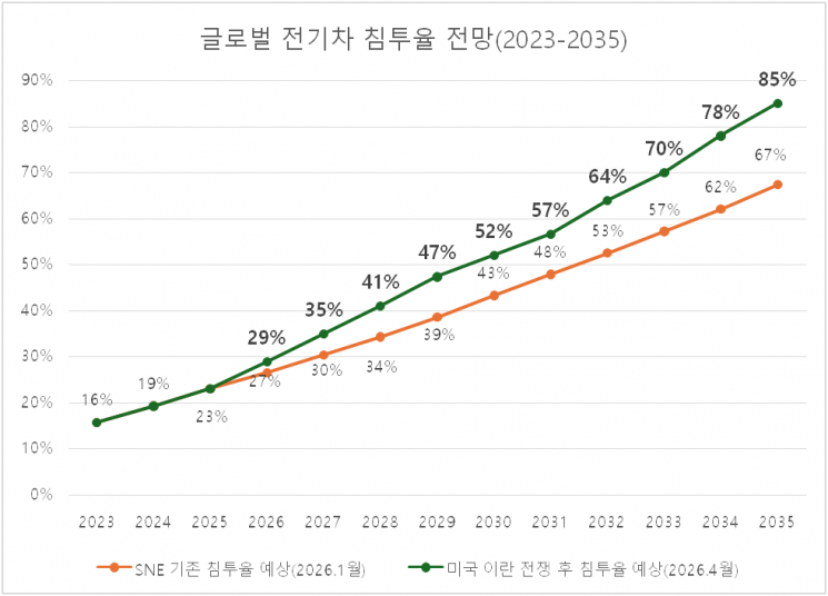 7일 에너지 분야 시장조사 업체인 SNE리서치는 "최근 미국-이란 전쟁으로 인한 유가 상승 영향으로 과거 3년간 침체했던 전 세계 전기자동차 시장의 수요가 올해는 이전 수요 예측 대비 0.5년 앞당겨질 것"이라고 전망했다. 이어 2027년에는 1년, 2028년에는 2년 이상 수요가 앞당겨질 것으로 예상했다.