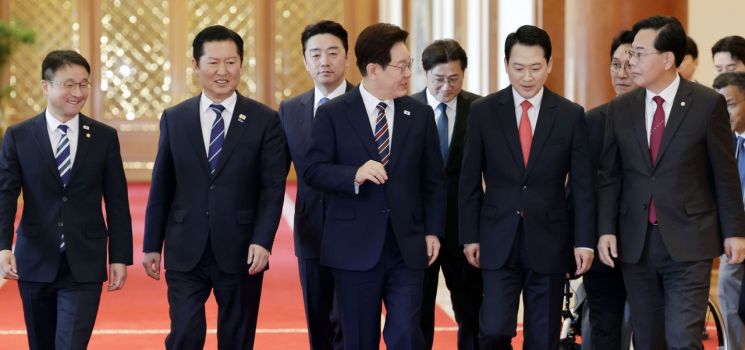이 대통령은 여야 간 정례적 소통 필요성도 강조했다. 이 대통령은 "우리가 의견이 좀 다를 경우에는 사실 만나서 자주 얘기하는 게 좋다"며 "오해는 최소한 많이 줄일 수 있기 때문에 저는 자주 이렇게 만나 뵙고 싶다"고 말했다. 이어 "많은 소통과 대화를 통해서 객관적 팩트들에 대해서는 최소한 확정을 하고 논쟁을 하는 게 좋다"며 "똑같은 사실을 놓고 전혀 다르게 얘기해 버리면 이거는 대화가 아니라 싸움이 되는 수가 있기 때문에 팩트 체크들은 언제나 하면서 진지하게 대화를 자주 하면 좋겠다"고 했다.
