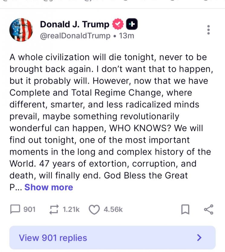 도널드 트럼프 미국 대통령은 7일(현지시간) 휴전 협상 시한을 약 12시간 남기고 "오늘 밤 한 문명(civilization) 전체가 사라져 다시는 되돌릴 수 없을 것이다"고 이란을 향해 재차 압박했다.