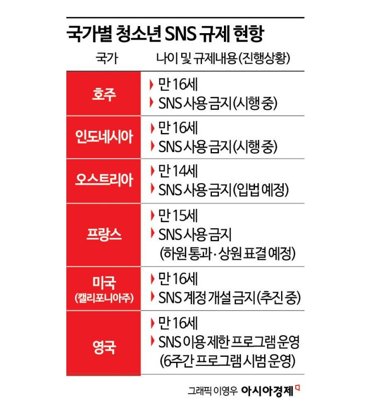 해외 국가들은 청소년들의 SNS 이용을 전면 제한하는 방식의 규제를 진행하고 있다. 호주는 지난해 말 세계 최초로 만 16세 미만 청소년의 SNS 이용을 전면 금지하는 법을 만들었고, 지난해 12월부터 시행했다. 이 법은 16세 미만 호주 청소년이 X나 틱톡 등 SNS에 계정을 만들면 해당 플랫폼에 최대 4950만 호주달러(약 515억원)의 벌금을 부과하는 내용을 담고 있다. 이후 인도네시아도 지난달 28일부터 만 16세 미만 이용자들의 SNS 계정 생성을 금지하는 법안을 시행했고, 덴마크, 프랑스, 스페인, 그리스, 영국, 캐나다, 말레이시아 등도 청소년의 SNS 이용을 제한하는 방안을 추진하고 있다.