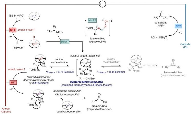 반응 시스템에 대한 도식화. 광자-유도 전기화학 반응 시스템 모식도. 코발트 촉매가 말단 알켄의 반응 경로를 제어해 시스-중간체 형성을 유도하고, 이후 고리화 반응을 거쳐 시스-아지리딘이 선택적으로 합성되는 과정을 나타냈다. 그림 및 설명 : 김현우 포항공대 교수
