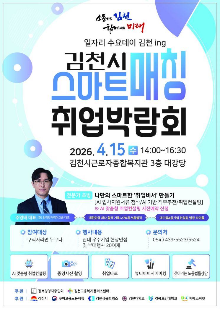 경북 김천시는 오는 15일 오후 2시, 김천시 근로자 종합복지관 3층 대강당에서 '김천시 일자리 스마트매칭 취업박람회'를 개최한다.
