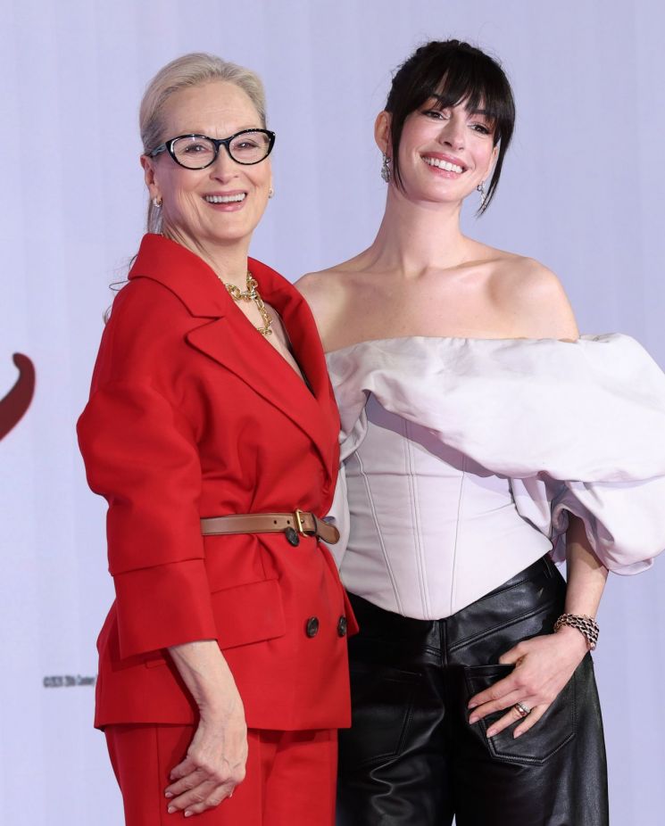 배우 메릴 스트립(왼쪽)과 앤 해서웨이가 8일 서울 종로구 포시즌스호텔에서 열린 영화 '악마는 프라다를 입는다 2' 기자간담회에서 포즈를 취하고 있다. 연합뉴스