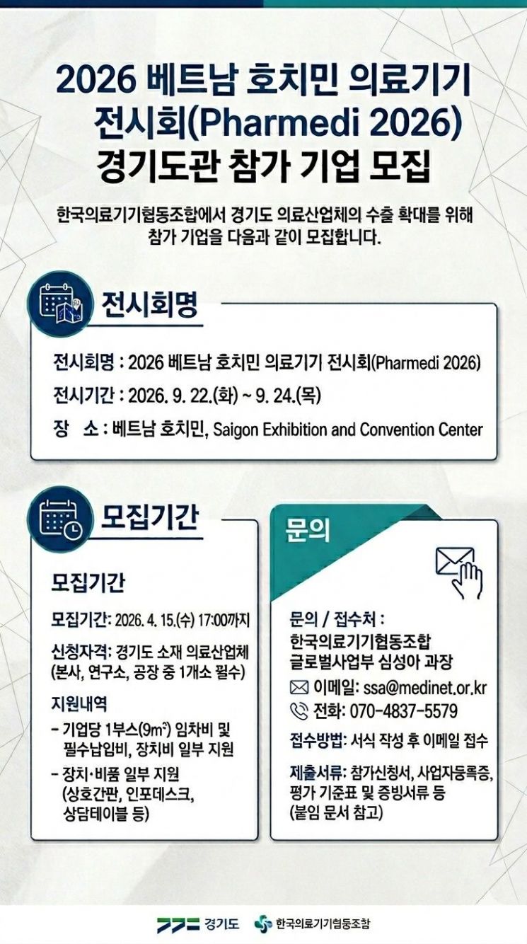 경기도가 오는 9월 베트남 호찌민 의료기기 전시회(Pharmedi 2026)에 참여할 기업을 이달 15일까지 모집한다.