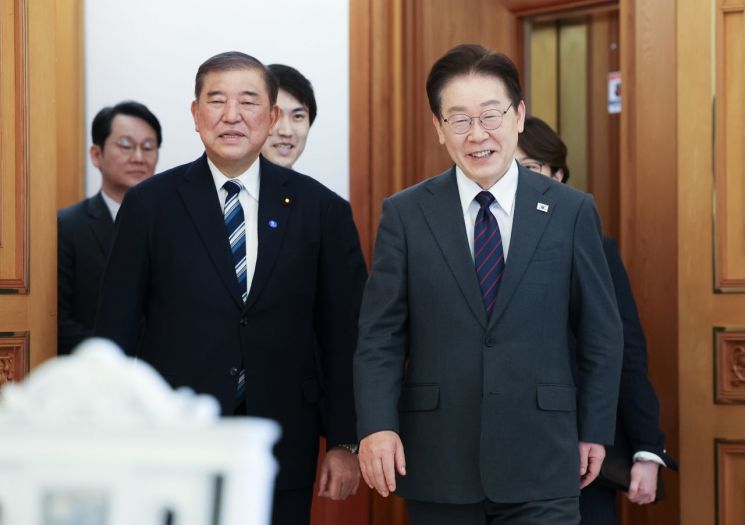 이 대통령은 이날 청와대에서 이시바 전 총리와 오찬을 갖고 이같이 밝혔다. 이 대통령은 "우리 총리께서 매우 넓은 시야로 국제 문제에도 관심도 많고 역할도 많이 하셨다"며 "앞으로도 이 복잡한 국제 환경 속에서 큰 역할을 계속해 주시길 바란다"고 당부했다.