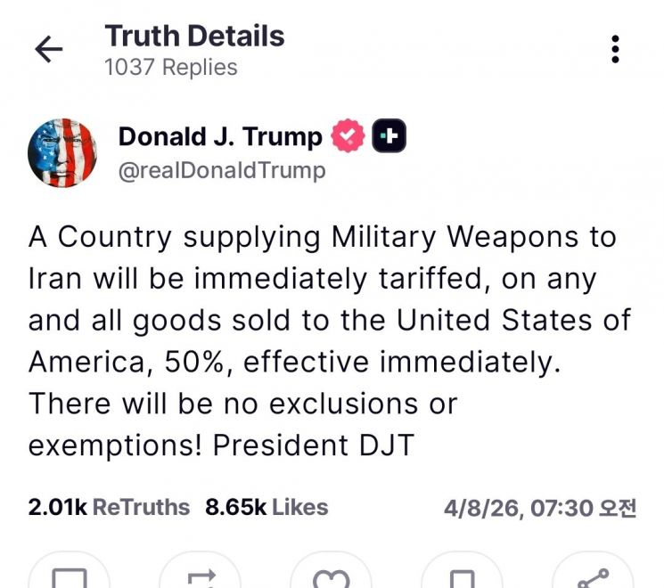 도널드 트럼프 미국 대통령은 8일(현지시간) "이란에 군사 무기를 공급하는 국가는 즉시 관세가 부과될 것이다"고 밝혔다.