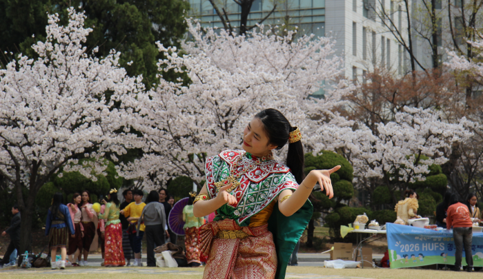 지난 3일 한국외대 서울캠퍼스에서 열린 '2026 HUFS(Hankuk University of Foreign Studies) 송크란 축제'에서 한 학생이 태국 전통 춤 공연을 하고 있다. 한국외대