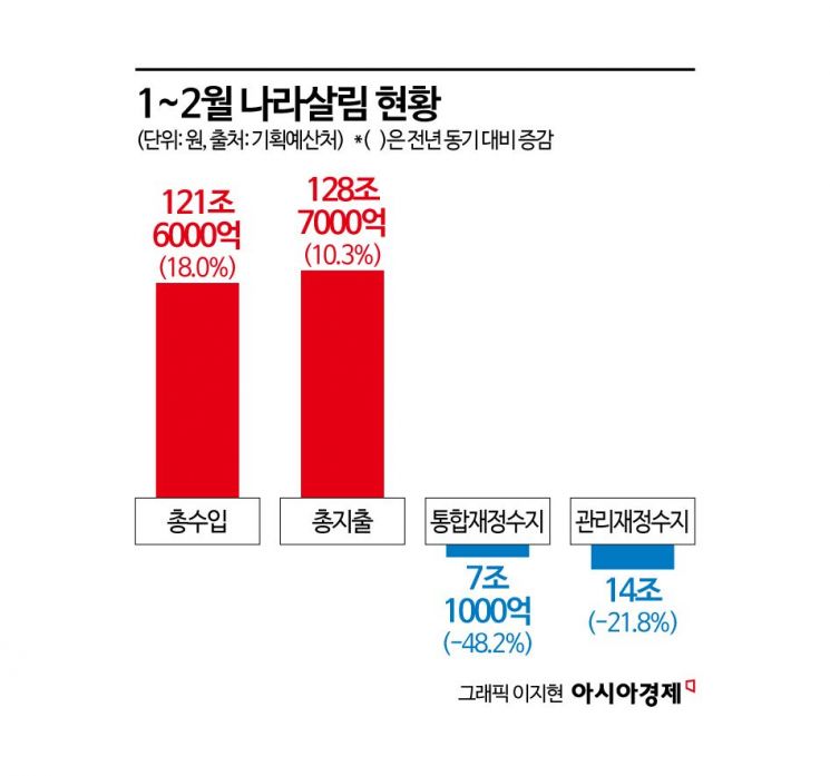 9일 기획예산처가 발표한 '월간 재정동향 4월호'에 따르면, 올해 1~2월 누계 총수입은 121조6000억원으로 전년 동기 대비 18조6000억원 증가했다. 총지출 규모는 지난해보다 12조원 늘어난 128조7000억원이었다. 지난해 같은 기간 대비 수입 증가폭이 지출 증가폭을 6조원 넘게 웃돌았다.