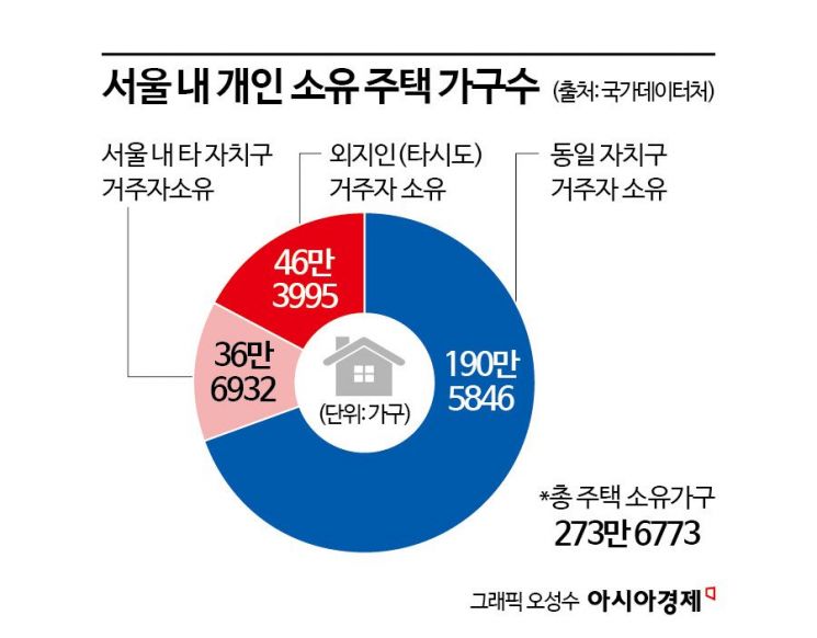 이를 제외한 약 83만가구는 서울에 주택을 보유하고도 거주하지 않는 비거주 주택으로 추정된다. 이 중 서울 내 다른 자치구에 거주하는 소유주가 보유한 주택은 36만6932가구, 타 시·도 거주자 즉 외지인이 보유한 주택은 46만3995가구로 집계된다. 36만가구가 임대를 종료하고 자가로 이동할 경우 시장에 나올 수 있는 매물은 크게 줄어들 수 있다.