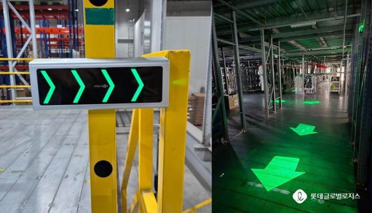 롯데글로벌로지스는 한국철도기술연구원과 함께 물류시설용 스마트 피난안내 시스템 실증에 나섰다고 10일 밝혔다. 스마트 피난안내 시스템 ‘스마트가이드’는 바닥에 피난 방향을 알려주는 화살표 모양의 레이저 조명을 비춰 복잡하고 어두운 시설 안에서도 피난 유도가 용이하다. 롯데글로벌로지스