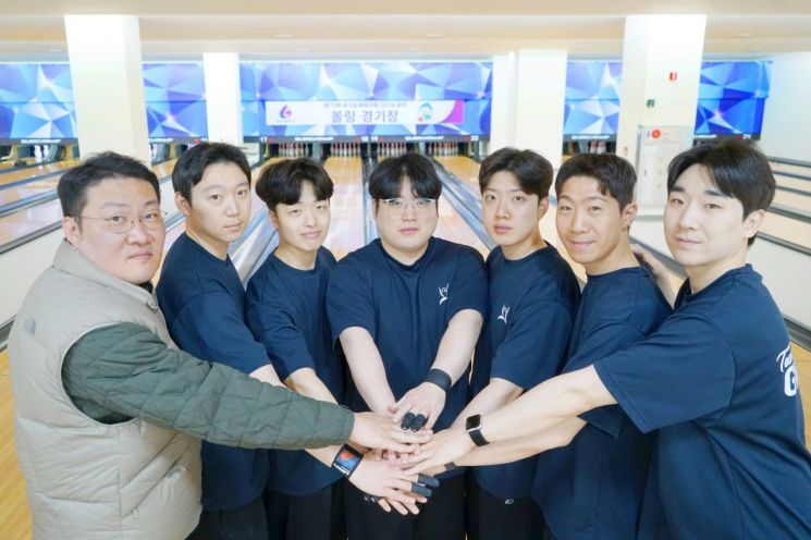 경기 광주시청 직장운동경기부 볼링팀이 오는 16일 광주시에서 개최되는 '제72회 경기도종합체육대회'를 앞두고 김영선 감독(왼쪽)과 선수들이 파이팅을 하고 있다. 경기 광주시 제공