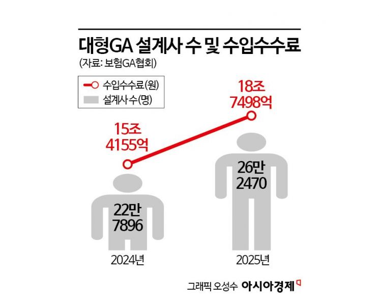 11일 보험업계에 따르면 최근 보험 모집시장은 GA 중심으로 채널 재편이 가속화되고 있다. 인카금융서비스·지에이코리아·한화생명금융서비스 등 연매출 1조원을 넘는 대형 GA가 잇따라 등장하고 설계사 수도 빠르게 증가하면서 GA 채널이 보험산업 내 핵심축으로 자리 잡는 모습이다. 보험GA협회는 "지난해 설계사 수가 늘면서 업계 내 인력 집중과 조직 규모 확대 흐름이 이어졌다"며 "아울러 생명·손해보험 모두에서 신계약 건수·금액 및 수입수수료가 큰 폭으로 증가해 GA 채널의 시장 내 영향력이 지속적으로 강화되고 있다"고 했다.