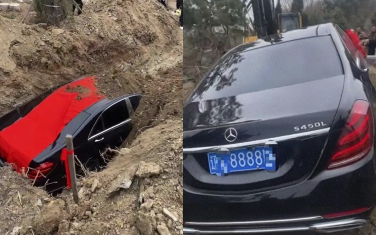 9일 중국 사회관계망서비스(SNS) 웨이보에는 랴오닝 지역의 한 장례식 현장을 담은 영상이 공유됐다. 공개된 영상에는 굴착기가 붉은 리본으로 장식한 검은색 메르세데스-벤츠 S450L 차량을 묘지 인근 구덩이로 내리는 모습이 담겼다. 영상에는 차량이 흙으로 덮이는 장면도 있다. 이 차는 중국에서 최소 110만위안(약 2억4000만원) 이상에 판매되는 모델로 알려졌다.