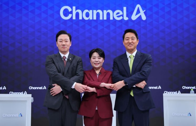국민의힘 서울시장 경선 후보인 박수민 의원(왼쪽부터), 윤희숙 전 의원, 오세훈 서울시장이 10일 서울 종로구 채널A 스튜디오에서 열린 국민의힘 서울시장 후보 제2차 TV 토론회에 참석해 포즈를 취하고 있다. 연합뉴스