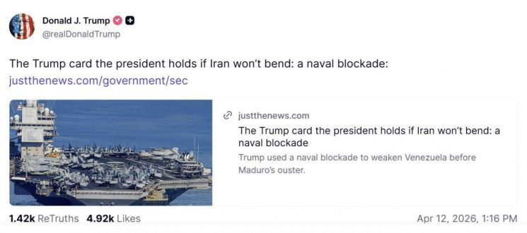 트럼프 대통령은 12일(현지시간) 협상 결렬 몇 시간 뒤 자신 소유의 SNS 트루스소셜에 '이란이 굴복하지 않을 경우 대통령이 보유한 트럼프 카드는 해상 봉쇄'라는 제목의 기사를 올렸다.