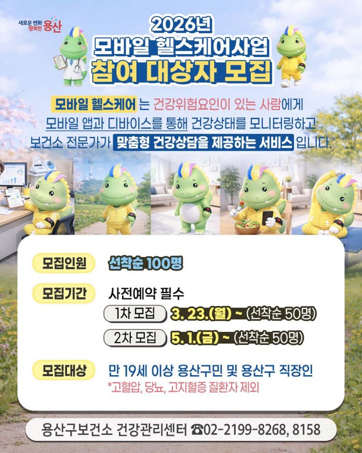 참여자에게는 활동량계·체성분계 등 건강관리 기기를 제공하며, 우수 참여자에게는 소정의 상품도 준다. 참여 희망자는 용산구보건소 건강관리센터(02-2199-8268, 8158)로 문의하면 된다.