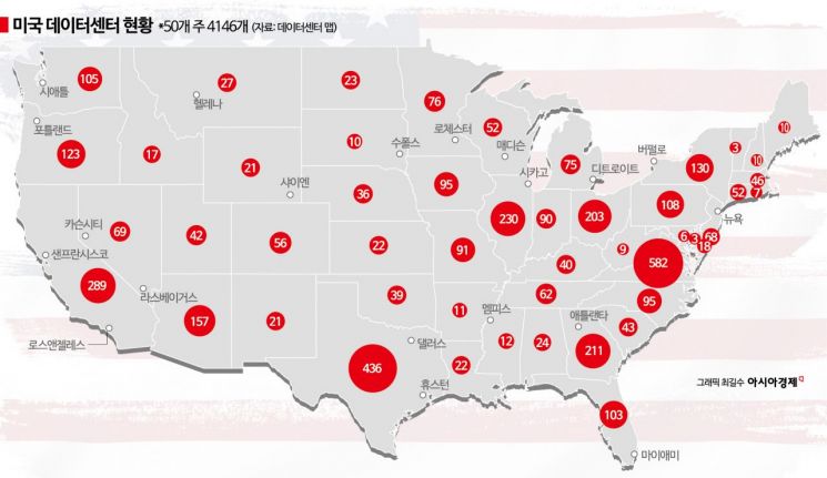 데이터센터 맵에 따르면 미국 50개 주에 걸쳐 4146개의 데이터센터가 있다. 582개의 데이터센터가 있는 버지니아주는 세계 최대 규모의 데이터센터 밀집 지역이며, 텍사스주에는 436개, 캘리포니아에는 289개가 있다. 빅테크들과 트럼프 행정부가 인공지능(AI) 선두주자로 만들기 위해 공격적으로 투자하면서, AI 개발 토대가 되는 초대형 하이퍼스케일 데이터센터가 급증하게 됐다.