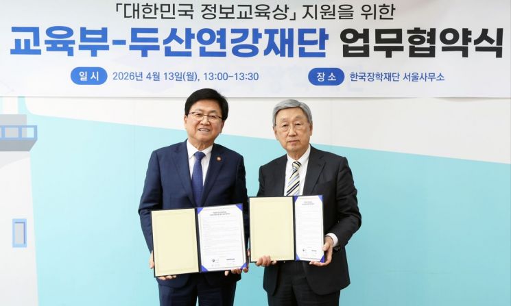 두산연강재단은 교육부가 선정하는 '대한민국 정보교육상' 수상자들에게 해외시찰을 지원하는 업무협약을 맺었다고 13일 밝혔다. 한국장학재단 서울사무소에서 열린 이날 협약식에는 최교진 교육부 장관, 박용현 두산연강재단 이사장 등이 참석했다.