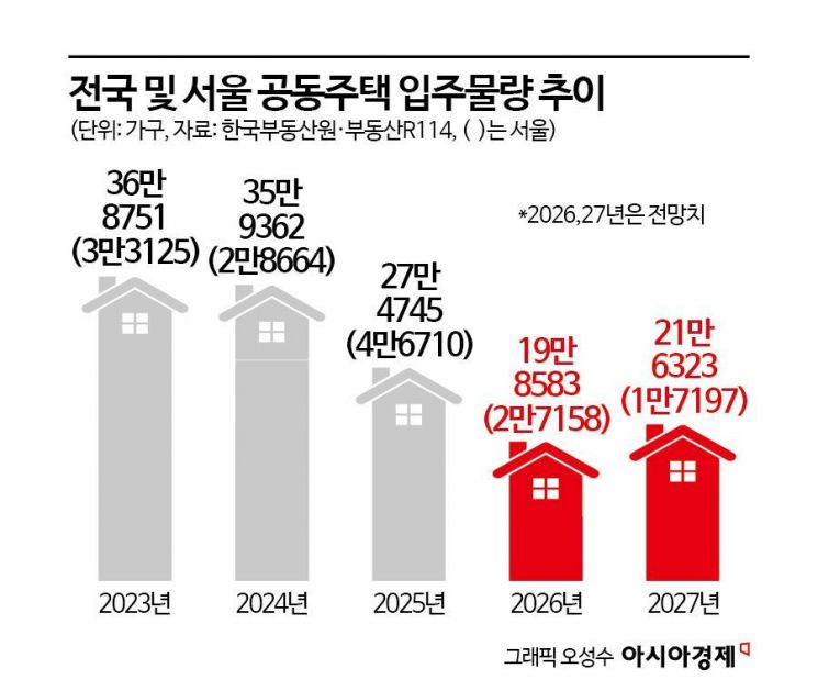 전·월세를 부동산의 구조적인 문제점으로 인식하는 건 서울·수도권 인허가와 착공 감소가 향후 입주 물량 축소로 이어질 수 있다는 우려 때문이다. 한국부동산원과 부동산R114 집계에 따르면 2023년과 2024년 각 3만가구 수준이던 서울 공동주택 입주 물량은 올해 2만7158가구, 내년 1만7197가구로 대폭 줄어들 전망이다. 공급 감소가 주거 불안을 자극할 가능성이 높다는 뜻이다.