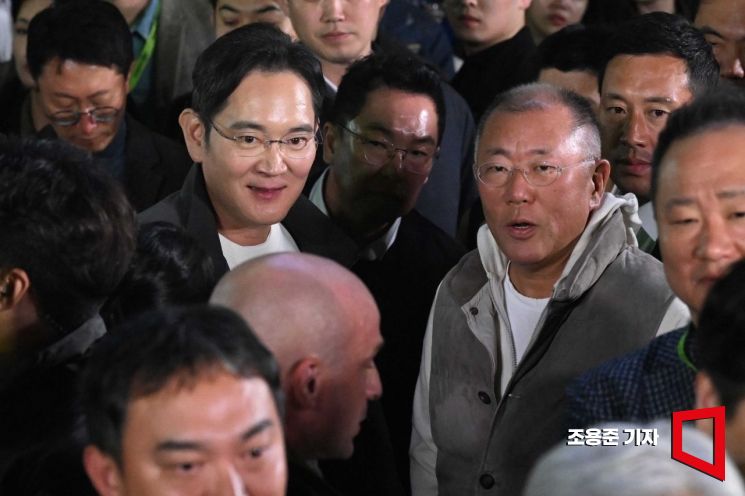 이재용 삼성전자 회장, 정의선 현대차그룹 회장이 30일 저녁 서울 강남구 코엑스광장에서 열린 '엔비디아 지포스 게이머 페스티벌' 주요 파트너 회사 부스로 이동하고 있다. 2025.10.30 조용준 기자