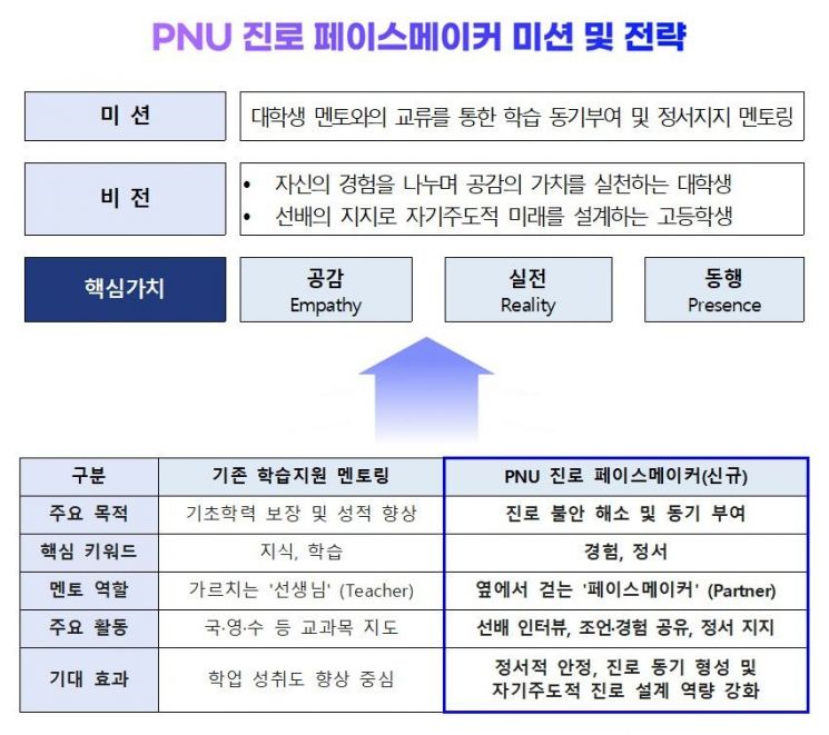 이 사업은 기존 교과 중심 멘토링과 달리 '가르치는 선생님'이 아닌 '함께 걷는 페이스메이커'라는 개념을 도입해, 멘티가 스스로 진로 목표를 구체화하도록 돕는데 중점을 둔다. 입시 불안과 진로 고민을 겪는 학생들에게 심리적 안정과 동기 부여를 동시에 제공할 것으로 기대된다.