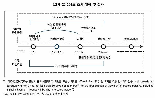우선 오는 15일 마감되는 의견 제출과 5월 5~8일 예정된 공청회를 '사전 면제 또는 예외(완충) 설계의 핵심 창구'로 활용해야 한다고 제언했다. 현재 미국 무역대표부(USTR)는 공식 홈페이지를 통해 15일 자정까지 301조 조사와 관련한 의견 제출, 공청회 참석 요청서를 받고 있다.