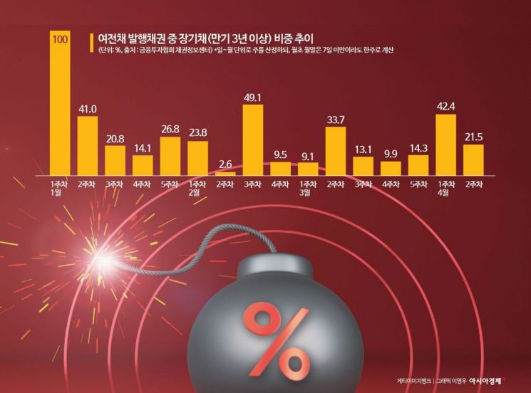 단기채 쏠림 심화도 문제다. 금융투자협회에 따르면 올해 여전채 장기채(만기 3년 이상) 발행 비중은 1월 평균 40.5%에서 2월 21.3%로 하락한 데 이어 중동 사태가 터진 3월에는 16.0%까지 떨어졌다. 4월 들어 32.0% 수준으로 반등했지만 여전히 변동성이 크다. 과거 대비 금리가 크게 오른 상황에서 단기물 위주 차환이 반복되면서 이자 부담이 빠르게 누적되고 차환 리스크를 키우고 있다는 지적이다. 한 카드사 관계자는 "장기채 수요가 사실상 실종되면서 현재는 단기채 위주로 발행이 이뤄지고 있다"며 "자금 조달이 원활하다고 보기 어렵다"고 토로했다.