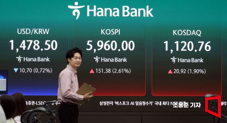 미국과 이란의 협상 재개 기대감에 국내증시가 2% 이상 상승 출발한 14일 서울 중구 하나은행 본점 딜링룸에서 직원이 증시와 환율 등을 모니터하고 있다. 이날 코스피는 전 거래일 대비 151.38p(2.61%) 오른 5960.00에 코스닥은20.77p(1.89%) 오른 1120.61에 장을 시작했다.