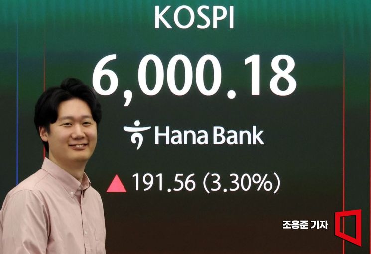 미국과 이란의 협상 재개 기대감에 국내증시가 3% 이상 상승 장중 6000선을 회복한 14일 서울 중구 하나은행 본점 딜링룸에서 직원이 증시와 환율 등을 모니터하고 있다. 이날 코스피는 전 거래일 대비 151.38p(2.61%) 오른 5960.00에 코스닥은20.77p(1.89%) 오른 1120.61에 장을 시작했다. 2026.4.14 조용준 기자