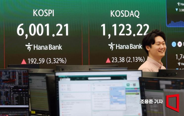 미국과 이란의 협상 재개 기대감에 국내증시가 3% 이상 상승 장중 6000선을 회복한 14일 서울 중구 하나은행 본점 딜링룸에서 직원이 증시와 환율 등을 모니터하고 있다. 이날 코스피는 전 거래일 대비 151.38p(2.61%) 오른 5960.00에 코스닥은20.77p(1.89%) 오른 1120.61에 장을 시작했다.
